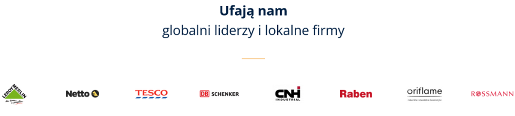 Do grona naszych Klientów należą m. in.: Auchan Polska, Binder International, Black Red White, CNH Polska, Dekorglass, Delphi Automotive Systems Polska, DHL Express, Farmacol, Grupa Muszkieterów (Intermarche, Bricomarche), Hellmann Worldwide Logistics, Leroy Merlin Polska, Michelin Polska – STOMIL Olsztyn, Oriflame, Sokołów, UPS Polska, Raben, FM Polska, Unilever Polska, DPD, PKS Multispedytor, Cargill, Colgate Palmolive, VALEO, PKP INTERCITY, Faurecia i wiele innych.